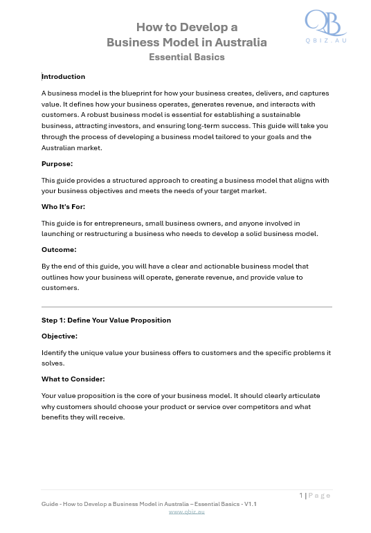 Product Description: The "How to Develop a Business Model in Australia" guide is an essential resource for entrepreneurs and small business owners looking to build a solid foundation for their business. This guide walks you through creating a business model that aligns with your goals, meets market demands, and ensures long-term success in the Australian market.
