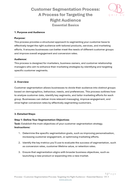 Product Description: The "Customer Segmentation Process: A Process for Targeting the Right Audience" provides businesses with a structured approach to divide their customer base into distinct groups. Designed for marketers, business owners, and customer relationship managers, this process helps create targeted marketing campaigns, optimise product offerings, and improve customer engagement by catering to the unique needs of different customer segments.