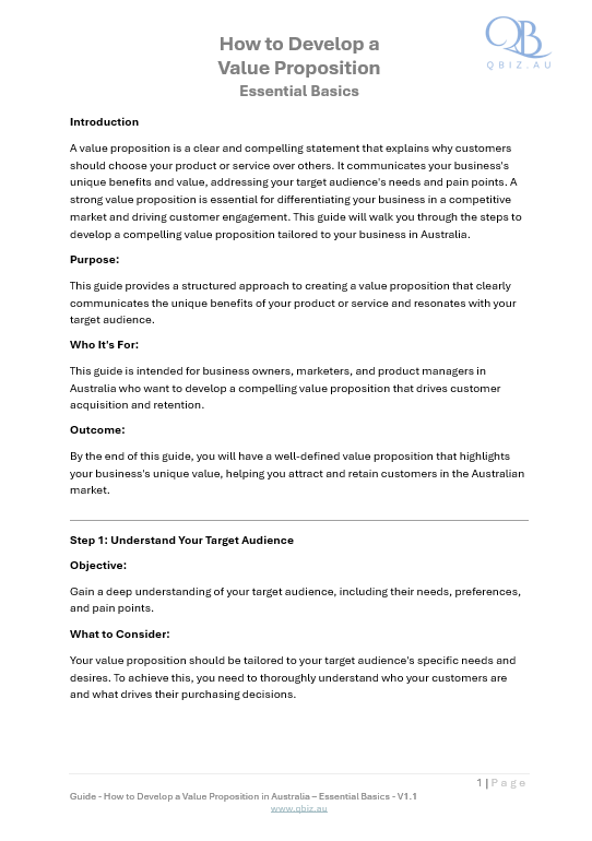 Download this version Now! To develop a value proposition that communicates your business's unique benefits. Use this guide to differentiate your brand, attract your target audience, and drive business success in the Australian market.