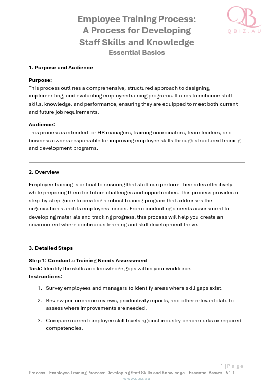 Download the "Employee Training Process" today and implement a structured system for developing staff skills and enhancing workforce performance. This guide will help your business build a knowledgeable, motivated team ready to meet future challenges.