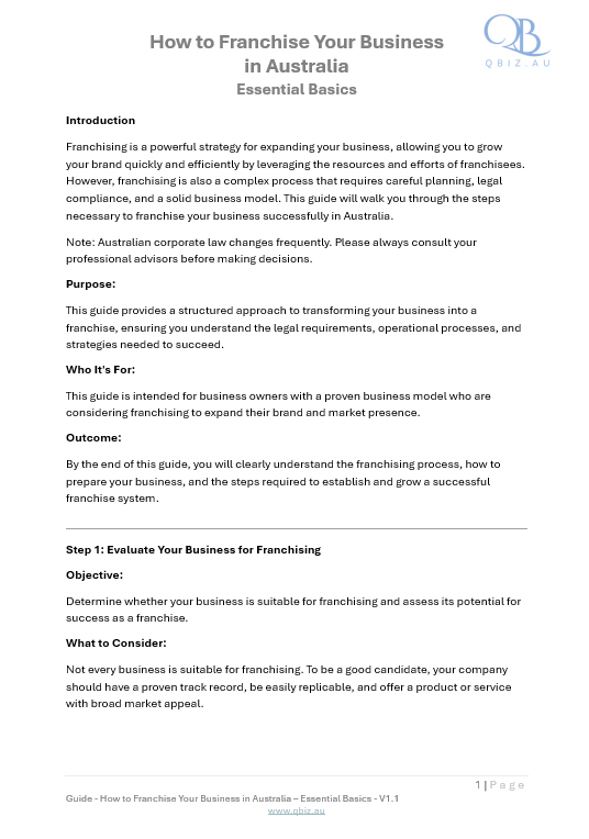 Product Description: The "How to Franchise Your Business in Australia" guide is designed to help business owners expand their brand through franchising. This comprehensive guide walks you through the critical steps, from evaluating your business's suitability for franchising to managing and growing a successful franchise system.