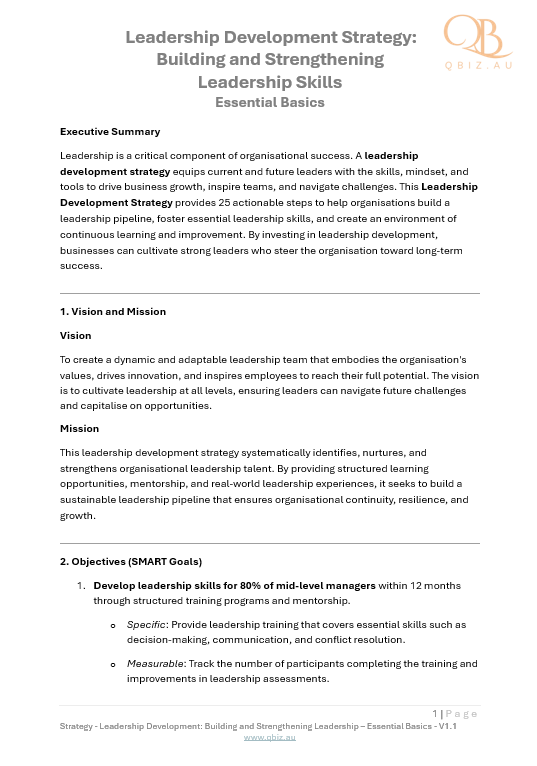 Download the "Leadership Development Strategy" today and implement a system that fosters leadership growth, enhances critical skills, and builds a strong leadership pipeline to guide your organisation toward long-term success.