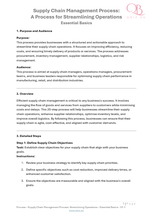 Product Description: The "Supply Chain Management Process: A Process for Streamlining Operations" provides businesses with a structured and efficient approach to managing the flow of goods and services. Designed for supply chain managers, procurement teams, and business leaders, this process focuses on improving operational efficiency, reducing costs, and ensuring timely deliveries. It covers procurement, logistics, inventory management, and supplier relationships, making it ideal for manufacturing, retail, and distribution industries.