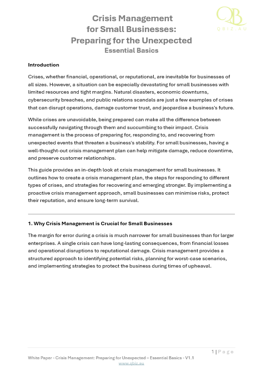 Product Description: The "Crisis Management for Small Businesses: Preparing for the Unexpected" white paper provides small business owners with the tools and strategies to manage crises and effectively ensure business continuity. From natural disasters and financial downturns to cybersecurity breaches and reputational issues, this guide outlines how to create a comprehensive crisis management plan. It includes practical steps for responding to various crises, mitigating damage, recovering with minimal disruption, and helping businesses maintain stability and protect their reputation.