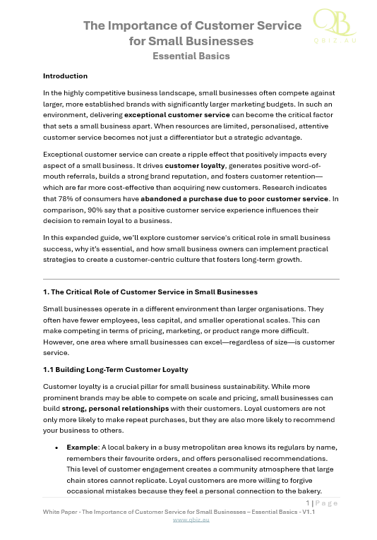Product Description: The "Importance of Customer Service for Small Businesses" white paper is a vital resource for small business owners looking to differentiate themselves from larger competitors through exceptional customer service. This guide explores how personalised, attentive customer service can create long-term loyalty, generate positive word-of-mouth, and build a strong brand reputation. It offers practical strategies for improving customer retention, reducing acquisition costs, and creating a customer-centric culture that fosters sustainable growth.